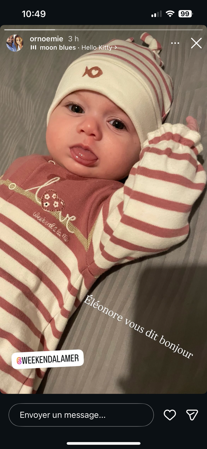 « Éléonore vous dit bonjour », a-t-elle légendé avec amusement, faisant une allusion à la pose de son enfant. Sur le cliché, la petite fille a le bras gauche en l’air, comme si elle saluait ses fans à travers l’écran. Le bout de chou, déjà bien éveillé, a le regard fixé sur l’objectif, comme une vraie mannequin miniature. Quant à sa tenue, elle était coordonnée avec un body rayé blanc et rose assorti à son bonnet. La fillette semble en tout cas avoir hérité des yeux foncés de son papa, même s’il est encore tôt pour remarquer une quelconque ressemblance physique directe avec ses deux parents. Le 11 décembre dernier, Guillaume et Noëmie se confiaient à Purepeople sur leur vie désormais bouleversée de la meilleure des façons par la parentalité.
